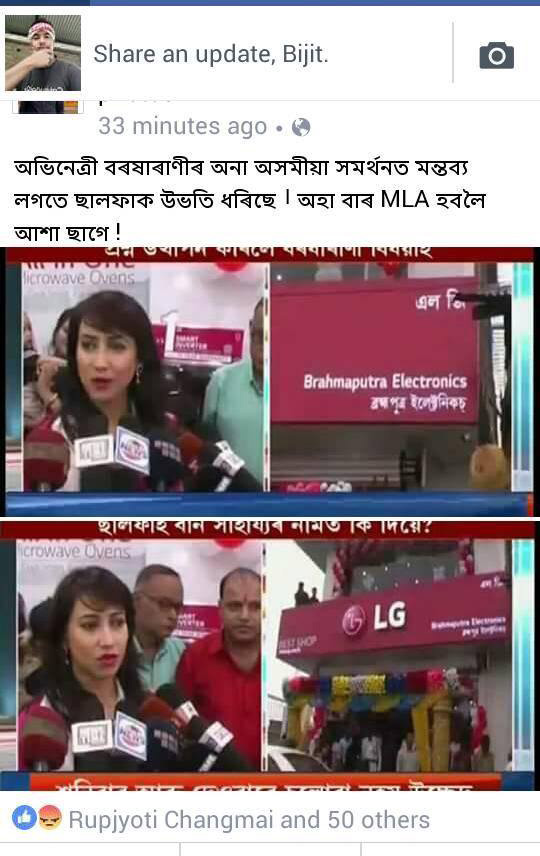 শনিবাৰে গোলাঘাটৰ এল জিৰ এটি শ্ব’ ৰুম মুকলি অনুষ্ঠানত ভাগ লৈ সাংবাদিকৰ সৈতে হোৱা বাৰ্তালাপত অভিনেত্ৰীগৰাকীয়ে ৰাজ্যবাসীক সকলো ক্ষেত্ৰতে চৰকাৰখনক দোষ দি নাথাকিবলৈ আহ্বান জনায়৷ ‘চৰকাৰক সকলো কথাতে দোষ দি থকাতো উচিত নহয়৷ কিছুমান সমস্যা ৰাইজে নিজেই সমাধান কৰি ল’ব লাগে৷’-নগাঁও কাণ্ডক লৈ সমগ্ৰ ৰাজ্য উত্তাল হৈ থকাৰ মাজতে এইদৰে চৰকাৰক ৰক্ষণাবেক্ষণ দিবলৈ চেষ্টা চলায় অভিনেত্ৰীগৰাকীয়ে৷