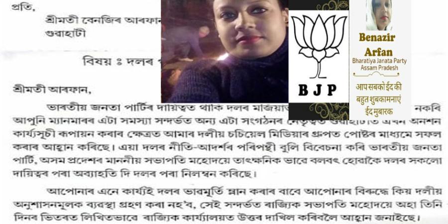 ৰাজ্যিক বিজেপিৰ সাধাৰন সম্পাদক দিলীপ শইকীয়াই নেত্ৰীগৰাকীক নিলম্বন সন্দৰ্ভত অৱগত কৰাৰ লগতে কৰাণ দৰ্শোৱাৰ জাননী জাৰি কৰে৷ গুৱাহাটী মহানগৰীৰ United Minority Peoples Forum নামৰ স্বেচ্ছাসেৱী অনুষ্ঠানটোৱে আয়োজন কৰা এটি অনুষ্ঠানৰ হৈ ফেচবুকত পোষ্ট দিছিল বেনজিৰে।