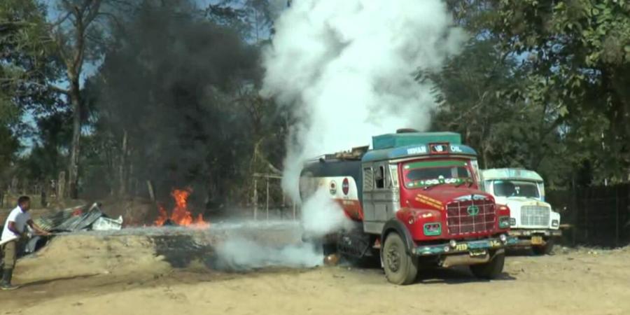 দাউ দাউকৈ জ্বলিল পাৰ্কিংত ৰখাই থোৱা তেল পৰিবাহী টেংকাৰ