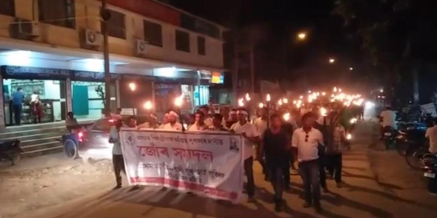 কেইবাশতাধিক লোকে যুৱ-ছাত্ৰ পৰিষদৰ চৰাইদেউ জিলা কাৰ্যালয়ৰ সন্মুখৰ পৰা সমদলত কৰি চৰকাৰ বিৰোধি শ্ল’গানেৰে সদৰ সোণাৰি নগৰৰ আকাশ বতাহ কপাই তোলে। প্ৰতিবাদকাৰীয়ে অনা-অসমীয়াৰ দপদপনি নচলিব বুলি সকীয়াই দিয়ে৷