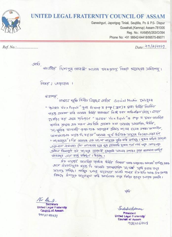 United Legal Fraternity Council Of Assam নামৰ সংগঠনটোৱে দেওবাৰে দিছপুৰ আৰক্ষী থানাত এজাহাৰ দাখিল কৰি দেৱজিত ৰয় নামৰ ফেচবুক একাউন্টৰ বিৰুদ্ধে ব্যৱস্থা গ্ৰহণৰ দাবী জনায়৷ অসমৰ সামাজিক, সংস্কৃতিৰ কাণ্ডাৰীৰ বিৰুদ্ধে এনে অশালীন মন্তব্য কৰা কাৰ্যই মানুহৰ মনত আঘাত হনা বুলি কৈ আৰক্ষীক তদন্ত কৰাৰ দাবী জনায়৷