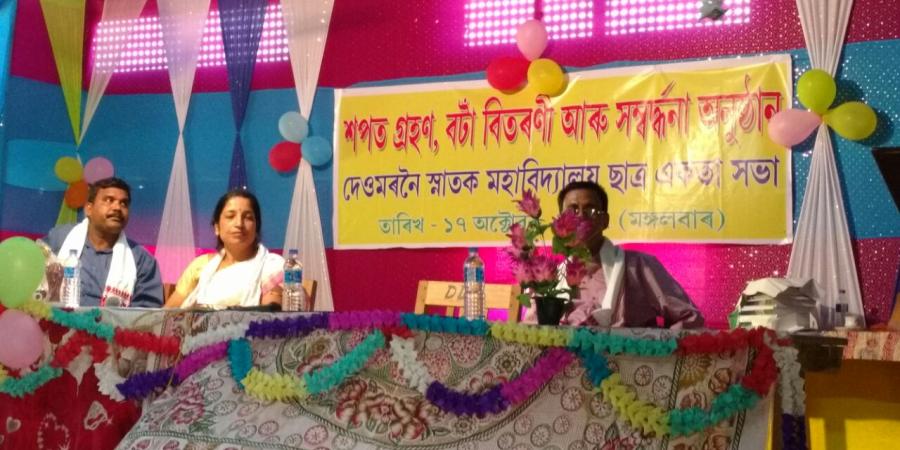 দলংঘাটঃ দৰং জিলাৰ ঐতিহ্যমণ্ডিত দেওমৰনৈ স্নাতক মহাবিদ্যালয়ত মঙলবাৰে ছাত্ৰ একতা সভাৰ এখন বিশেষ সভা অনুষ্ঠিত হৈ যায়৷ সভাত মহাবিদ্যালয় খনৰ ছাত্ৰ একতা সভাৰ নৱনিৰ্বাচিত সদস্যসকলক শপত গ্ৰহণ কৰাৰ লগতে বিশিষ্ট ব্যক্তিক সম্বৰ্ধনা যাচে মহাবিদ্যালয় কৰ্তৃপক্ষই৷