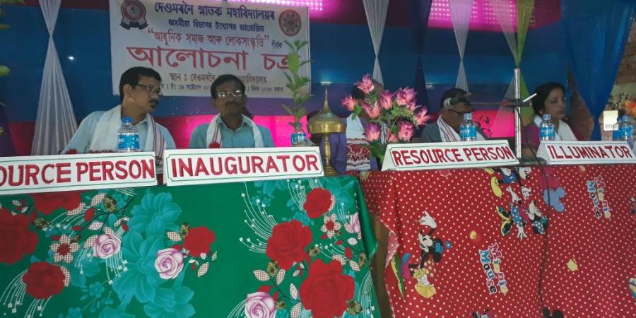 দলংঘাটঃ দৰং জিলাৰ পশ্চিম প্ৰান্তত অৱস্থিত একমাত্র উচ্চ শিক্ষানুষ্ঠান দেওমৰনৈ স্নাতক মহাবিদ্যালয়ত অসমীয়া বিভাগৰ উদ্যোগত আজি মহাবিদ্যালয়ৰ প্ৰেক্ষাগৃহত আধুনিক সমাজ আৰু লোক সংস্কৃতি শীৰ্ষক আলোচনা চক্ৰ অনুষ্ঠিত হয়।
