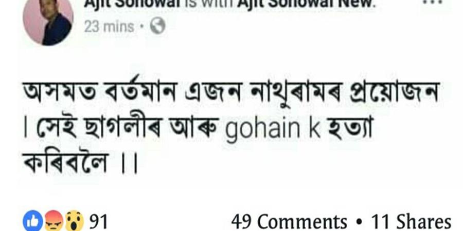 অজিত সোণোৱাল নামৰ ধেমাজীৰ যুৱকজনে মঙলবাৰে নিজৰ ফেচবুকৰ টাইমলাইনত আপডেট দি কয় "অসমত বৰ্তমান এজন নাথুৰামৰ প্ৰয়োজন। সেই ছাগলীৰ আৰু Gohain K হত্যা কৰিবলৈ"৷ আপডেট দিয়াকৰ পিছতে বহু লোকে চেয়াৰ কৰে আপডেতটো৷ কিছুসময়ৰ পিচতে ফেচবুকৰ আপডেটতো ভাইৰেল হৈ পৰে। দিল্লীত ড০ গোঁহাই উপস্থিত থক এখন সভাত জমিয়তৰ সভাপতি মৌলানা আৰ্শ্বাদ মাদানীয়ে NRCত অসমৰ সংখ্যালঘূ সকলৰ নাম নাথাকিলে অসম ৰক্তাক্ত হ'ব বুলি মন্তব্য দিছিল৷
