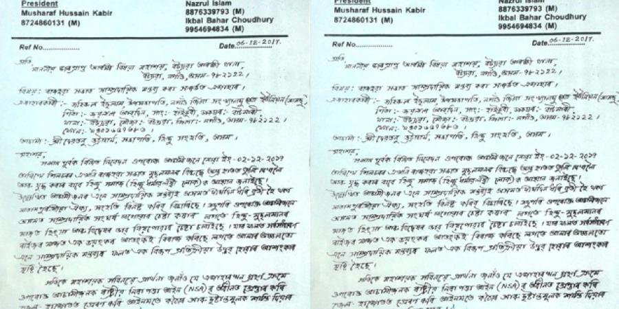 হিন্দু-মুছলমানৰ মাজত হিংসা আৰু বিদ্বেষৰ ভাৱ বিয়পোৱাৰ চেষ্টা চলোৱা হিন্দু সংহতি'ৰ নেতা দেৱতনু ভট্টাচাৰ্যৰ মন্তব্যৰ বিৰোধীতা কৰি সদৌ অসম সংখ্যালঘু ছাত্ৰ ইউনিয়নৰ নগাঁও জিলা সমিতিৰ উপ-সভাপতি জহিৰুল ইছলামে বুধবাৰে এজাহাৰ দাখিল কৰে৷ সাতামপুৰুষীয়া ঐক্য, সংহতি বিনষ্ট কৰিব বিচৰা দেৱতনু ভট্টাচাৰ্যক ৰাষ্ট্ৰীয় নিৰাপত্তা আইন (NSA)ৰ অধীনত গ্ৰেপ্তাৰৰ দাবী জনায় বটদ্ৰৱা আৰক্ষী থানাত ভাৰতীয় দণ্ড বিধিৰ ১৫৩(A) ধাৰাৰ অধীনত ২৩৯/১৭ নম্বৰত এটি গোচৰ ৰুজু কৰে।