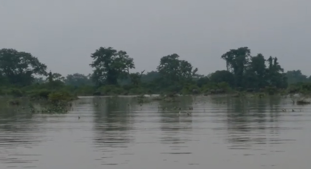 ব্ৰহ্মপুত্ৰ ফেনে-ফোটোকাৰে বাঢ়ি অহাৰ ফলতে এনেদৰে প্লাৱিত হৈ পৰিছে উদ্যানখননৰ বিস্তীৰ্ণ অঞ্চল। অধিকাংশ জীৱ-জন্তুৱেই এতিয়া প্ৰাণৰ সংশয়ত কাৰ্বি পাহাৰ অভিমুখে ৰাওনা হৈছে৷