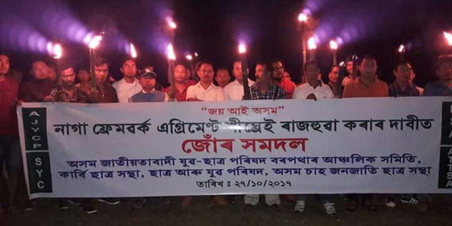 ফ্ৰেমৱৰ্ক এগ্ৰিমেন্ট ৰাজহুৱা কৰাৰ দাবীত ৰাজ্যজুৰি যুৱ-ছাত্ৰ পৰিষদৰ জোঁৰ সমদল