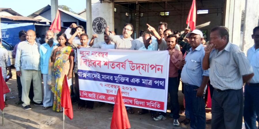 বিপ্লৱৰ শতবৰ্ষ দিৱসৰ সৈতে সংগতি ৰাখি প্ৰথমে পতাকা উত্তোলন কৰা হয়। পতাকা উত্তোলন কৰে আশিষ গাংগুলিয়ে। শতবৰ্ষ দিৱসত অংশগ্ৰহন কৰে চিপিআই এম-এলৰ ৰাজ্যিক নেতা বিবেক দাস, বিশ্বনাথ জিলা সমিতিৰ সম্পাদক লীলা শৰ্মা, কৃষক মহাসভাৰ আহ্বায়ক অনন্ত হাজৰিকা, লক্ষীকান্ত কূৰ্মী, বিপ্লৱী যুৱ সন্থাৰ বিশ্বনাথ জিলা সমিতিৰ আহ্বায়ক পৰিমল গোঁড়, বিকাশ চুব্বা আৰু ধনঞ্জয় দাসে।