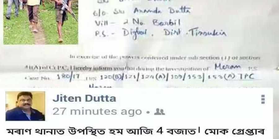 ডিব্ৰুগড় আৰক্ষীয়ে অখিলৰ সৈতে একেখন সভাত উপস্থিত থকা জীতেন দত্তৰ বিৰুদ্ধে ভাৰতীয় দণ্ড বিধিৰ ১২০(বি)/১২১(এ)/১২৪(এ)/১০৯/১৫৩/১৫৩(এ) ধাৰাত ১৮০/১৭ নম্বৰত গোচৰ ৰুজু কৰি জাননী জাৰি কৰে৷ তাৰ মাজতে আজি জীতেন দত্তই ফেচবুক যোগে আজি আৰক্ষী থানাত উপস্থিত হোৱাৰ কথা প্ৰকাশ কৰাত চাঞ্চল্যৰ সৃষ্টি কৰিছে৷ একাংশ প্ৰাক্তন আলফাই জীতেন দত্তক গ্ৰেপ্তাৰ কৰিলে ভয়াবহ পৰিস্থিতিৰ সন্মুখীন হ’ব লাগিব বুলি ৰাজ্য চৰকাৰক সকীয়াই দিয়ে৷ জানিব পৰা মতে, বিশাল গাড়ীৰ কনভয়ৰে মৰাণত উপস্থিত হ’ব আলফানেতাগৰাকী৷