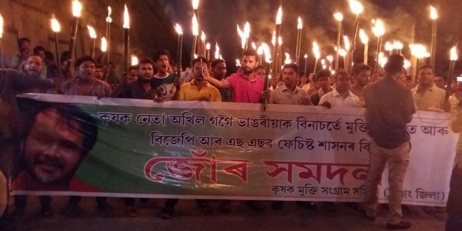 চাবুৱা/কাজলগাঁওঃ কৃষক নেতা অখিল গগৈক গ্ৰেপ্তাৰৰ ৬০ ঘন্টা পাৰ হোৱাৰ পাছতো ৰাজ্যজুৰি প্ৰতিবাদ অব্যাহত আছে৷ দল-সংগঠনে চৰকাৰৰ বিৰুদ্ধে প্ৰতিবাদ সাব্যস্ত কৰি অখিলক মুক্তিৰ দাবী জনায়৷ ডিব্ৰুগড় জিলাৰ চাবুৱাত শুকুৰবাৰে কৃষক মুক্তি সংগ্ৰাম সমিতি আৰু ছাত্ৰ মুক্তি সংগ্ৰাম সমিতিৰ উদ্যোগত আৰু মটক যুৱ ছাত্ৰ পৰিষদৰ সহযোগত কেইবাশতাধিক লোকে হাতে হাতে জোঁৰলৈ সমদল কৰি অখিলক গ্ৰেপ্তাৰৰ প্ৰতিবাদ জনায়৷