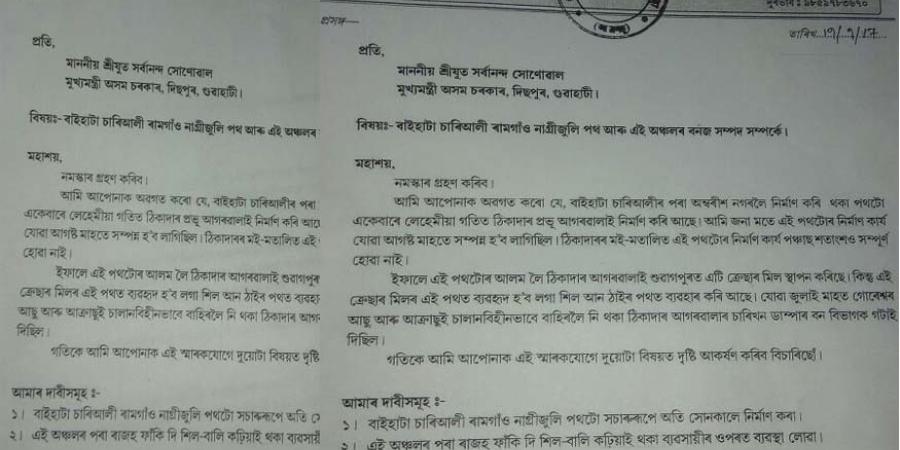 আক্ৰাছুৰ নেতা শংকৰ ৰাজবংশী, আছু নেতা ডিম্পল ডেকা, প্ৰাক্তন আছু নেতা দিপেন শৰ্মাই স্মাৰত পত্ৰ প্ৰদান কৰি ঠিকাদাৰ প্ৰভূ আগৰৱালাই চাৰিআলি ৰামগাঁও-নাগ্ৰিজুলি গড়কাপ্তানি পথ নিৰ্মাণত ব্যাপক দুৰ্নীতি সংঘটিত কৰাৰ পাছতো ৰাজ্য চৰকাৰে ব্যৱস্থা নোলোৱাৰ অভিযোগ উত্থাপন কৰে৷ ৰাজ্যৰ আগশাৰীৰ ঠিকাদাৰ প্ৰভূ আগৰৱালাই ৰাইজ, প্ৰশাসন আৰু বন বিভাগৰ চকুত ধূলি দি বনজ সম্পদ ধ্বংস কৰি চোৰাংকৈ বালি-শিল সৰবৰাহ কৰি থকা বুলি অভিযোগ উত্থাপন কৰি সংগঠন দুটাই৷ বাক্সা-কামৰূপ জিলাৰ গুৰুত্বপূৰ্ণ বাইহাটা চাৰিআলি-ৰামগাঁও নাগ্ৰীজুলি পথ নিৰ্মাণৰ দায়িত্ব লাভ কৰাৰ সুবাদতে ক্ৰেছাৰ মেচিন বহুৱাই ঠিকাদাৰগৰাকীয়ে ৰাজ্যৰ আন ঠাইলৈ শিল বালি কঢ়িওৱা বুলি কয়৷
