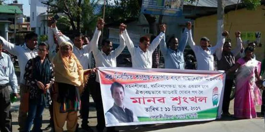 নলবাৰীঃ সৰ্বভাৰতীয় কংগ্ৰেছৰ সভাপতিৰ দায়িত্ব লোৱা ৰাহুল গান্ধীক নলবাৰী জিলা কংগ্ৰেছ, মহিলা কংগ্ৰেছ, যুৱ কংগ্ৰেছ সমিতিয়ে শুভেচ্ছা যাচে৷ নলবাৰী ৰাজীৱ ভৱনৰ সন্মুখত এক বৃহৎ মানৱ শৃংখলা কাৰ্যসূচী ৰূপায়ন কৰি নৱ নিৰ্বাচিত সভাপতি ৰাহুল গান্ধীক অভিনন্দন জ্ঞাপন কৰে।