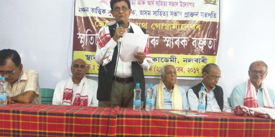 নলবাৰীঃ দেওবাৰে নন্দন তাত্ত্বিক, সাহিত্যিক, অসম সাহিত্য সভাৰ প্ৰাক্তন সভাপতি, শিক্ষাবিদ ত্ৰৈলোক্যনাথ গোস্বামীৰ স্মৃতিচাৰণ সভা আৰু স্মাৰক বক্তৃতা অনুষ্ঠান অনুষ্ঠিত হৈ যায়৷ অসম সাহিত্য সভাৰ শতবৰ্ষ উদযাপনৰ নলবাৰী জিলা সমিতি, জিলা সাহিত্য সভা আৰু আৰ্য শাখা সাহিত্য সভাৰ উদ্যোগত নলবাৰী শংকৰদেৱ একাডেমীত আবেলি ৩ বজাত নলবাৰী জিলা সাহিত্য সভাৰ সভাপতি ৰমানাথ বৰুৱাৰ সভাপতিত্বত অনুষ্ঠিত হোৱা সভা উদ্বোধন কৰে সাহিত্যিক অশ্বিনী কুমাৰ শৰ্মাই। অনুষ্ঠানত মূখ্য বক্তা হিচাপে উপস্থিত থাকে সাহিত্যিক ডঃ বসন্ত কুমাৰ ভট্টাচাৰ্যই।
