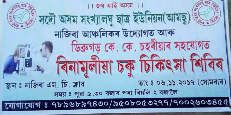 শিমলুগুৰিঃ সদৌ অসম সংখ্যালঘু ছাত্ৰ ইউনিয়নৰ নাজিৰা আঞ্চলিক সমিতিৰ উদ্যোগত আৰু স্বেচ্ছাসেৱী অনুষ্ঠান কে কে চহৰীয়াৰ সহযোগত ০৬ অক্টোবৰত অনুষ্ঠিত হ’ব বিনামূলীয়া চকুপৰীক্ষা আৰু চিকিৎসা শিবিৰ।