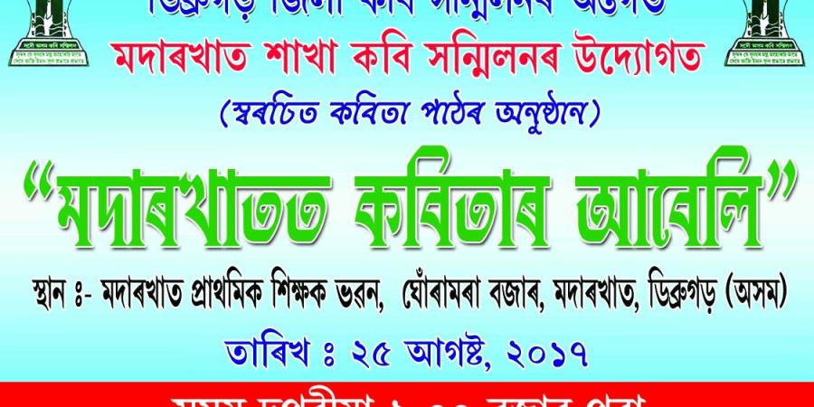 লাহোৱালঃ কবি সন্মিলনৰ ডিব্ৰুগড় জিলাৰ মদাৰখাত শাখা সমিতিয়ে ‘মদাৰখাতত কবিতাৰ আবেলি’ শীৰ্ষক কবিতা অনুষ্ঠানৰ আয়োজন কৰিছে৷