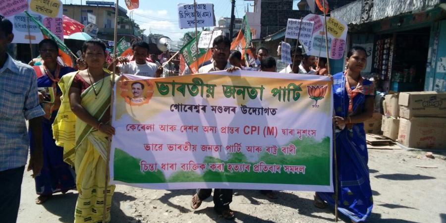 গোৰেশ্বৰঃ চিপিআইএম সমৰ্থকে কেৰেলাত বিজেপি আৰু আৰ এচএচ কৰ্মীৰ ওপৰত আক্ৰমণ কৰাৰ প্ৰতিবাদত বাক্সা জিলাৰ গোৰেশ্বৰ মণ্ডল বিজেপিয়ে আজি গোৰেশ্বৰ চহৰত এক প্ৰতিবাদী সমদল উলিয়ায়।