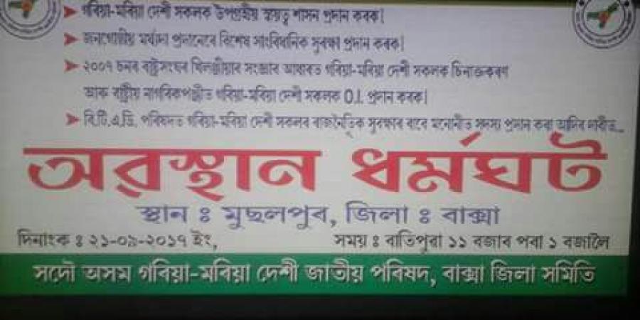 মুছলপুৰঃ বাক্সা জিলাৰ সদৰ মুছলপুৰৰ দূৰ্গাপূজা মণ্ডপত বিভিন্ন দাবীৰ সমৰ্থনত আজি গৰিয়া মৰিয়া দেশী জাতীয় পৰিষদে দিনৰ ১১ বজাৰ পৰা ১ বজালৈ অৱস্থান ধৰ্মঘট কাৰ্যসূচী ৰূপায়ন কৰে।