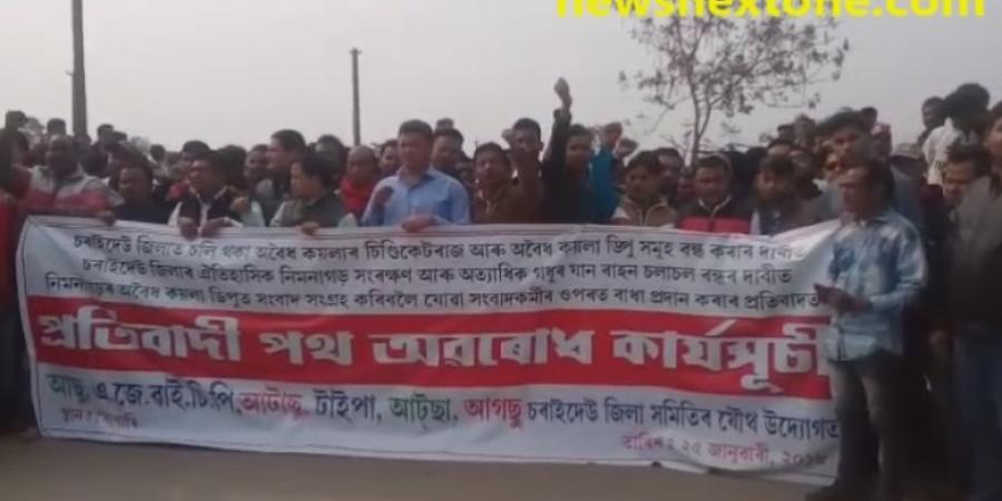 চৰাইদেউঃ বৃহস্পতিবাৰে উজনি অসমৰ চৰাইদেউত ৰাজ্য চৰকাৰৰ বিৰুদ্ধে কেইবাশতাধিক লোকে উত্তাল প্ৰতিবাদ৷ চৰাইদেউৰ নিমনাগড়ৰ অবৈধ কয়লা ডিপোৰ বাতৰি সংগ্ৰহ কৰিব যোৱা সংবাদকৰ্মীক আক্ৰমণৰ বিৰুদ্ধে বৃহস্পতিবাৰে পুৱাই ৰাজ পথলৈ ওলাই আহে শ-শ ৰাইজ৷ চৰাইদেউ মহকুমা ছাত্র-সন্থা, আটাছু, অসম জাতীয়তাবাদী যুৱ-ছাত্র পৰিষদ, টাইপা, আটছা, গোৰ্খা ছাত্র-সন্থা আৰু চৰাইদেউ প্ৰেছ-গীল্ডৰ উদ্যোগত চৰাইদেউ জিলাৰ ধোঁদৰ আলি অৱৰোধ কৰি ৰাজ্য চৰকাৰৰ বিৰুদ্ধে শ্ল’গানেৰে উত্তাল প্ৰতিবাদ সাব্যস্ত কৰে৷
