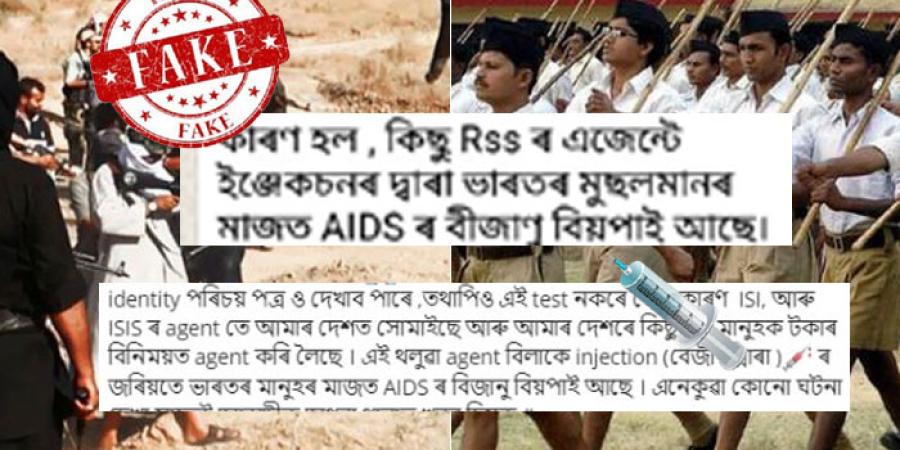 তাৰ মাজতে ৰাজ্যত ভাইৰেল হৈছে আন এটা মেছেজ৷ হাজাৰ হাজাৰ লোকে শ্বেয়াৰ কৰা এই মেছেজটোত হিন্দুক ISISৰ ভয় আৰু মুছলমানক RSSৰ ভয় দেখুওৱা হৈছে৷ মেছেজকেইটাত কোৱা হৈছে, "সাৱধান-অতি গুৰুত্বপূৰ্ণ এটা খবৰ। যদি কোনো ব্যক্তি আহি ঘৰত কয় যে আমি ভাৰতীয় মেডিকেল কাউঞ্চিলৰ পৰা আহিছো এটা test কৰিবলৈ, সকলো ভাৰতীয় নাগৰিকৰ তেজত কিমান কিমান পৰিমাণৰ blood sugar আছে! আৰু এই পৰীক্ষাৰ খৰছ সম্পূৰ্ণ বিনামূলীয়া। সকলোকে হাত যোৰ কৰিছো যে এই test ভুলতো যেন নকৰে। তেওঁলোকে identity পৰিচয় পত্ৰ দেখাব পাৰে, তথাপিও এই test নকৰে যেন, কাৰণ ISI আৰু ISISৰ agentতে আমাৰ দেশত সোমাইছে আৰু আমাৰ দেশৰে কিছুমান মানুহক টকাৰ বিনিময়ত agent কৰি লৈছে। এই থলুৱা agent বিলাকে injection (বেজীৰ দ্বাৰা)ৰ জৰিয়তে ভাৰতৰ মানুহৰ মাজত AIDSৰ বীজাণু বিয়পাই আছে। এনেকুৱা কোনো ঘটনা দেখা মাত্ৰেই আৰক্ষীক অথবা থানাত খবৰ দিয়ক আৰু এই খবৰ আপোনাৰ প্ৰিয় জনকো দিয়ে যেন।"