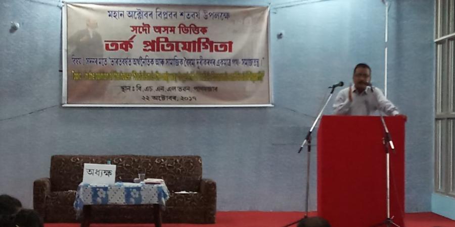 গুৱাহাটীঃ পৃথিৱী বিখ্যাত অক্টোবৰ বিপ্লৱৰ শতবর্ষ উদযাপনৰ সৈতে সংগতি ৰাখি দেওবাৰে গুৱাহাটী মহানগৰীৰ বিএছএনল মুখ্য কাৰ্যালয়ৰ সভাগৃহত অনুষ্ঠিত হয় সদৌ অসম ভিত্তিত তৰ্ক প্ৰতিযোগিতা৷ "ভাৰতবৰ্ষৰ অৰ্থনৈতিক আৰু সামাজিক বৈষম্য দূৰ কৰাৰ একমাত্ৰ পথ সমাজতন্ত্ৰ" শীৰ্ষক বিষয়ৰ ওপৰত ভাৰতীয় ছাত্র সন্মিলনী চমুকৈ এছএফএইৰ উদ্যোগত অনুষ্ঠিত হয় তৰ্ক প্ৰতিযোগিতা।