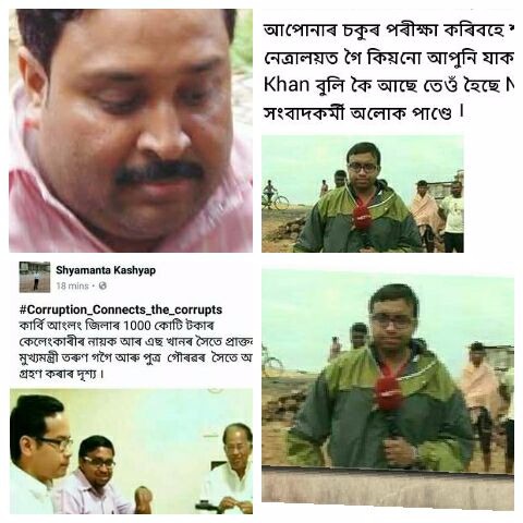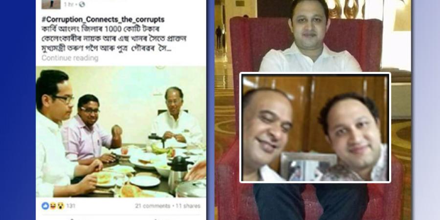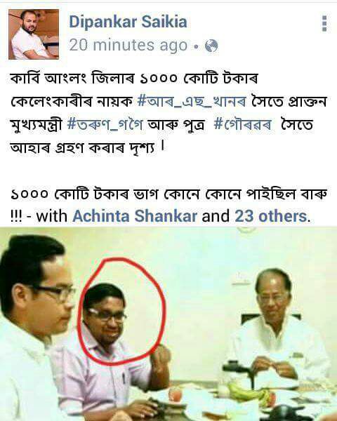 এই ফটোখনে বিশেষ কোনো নোহোৱা-নোপোজা নতুবা গুপুত কথা উদ্ধাৰৰ বাবে চৰ্চালৈ অহা নাই৷ চৰ্চালৈ আহিছে অপৰিপক্কতা, জ্ঞানৰ অভাৱৰ পৰিচয় দিয়াৰ ফলত৷ প্ৰাক্তন মুখ্যমন্ত্ৰী তথা অগপ দলৰ নেতা প্ৰফুল্ল কুমাৰ মহন্তৰ পুত্ৰ শ্যামন্ত কাশ্যপে আন এগৰাকী ১৫ বছৰে ৰাজ্য শাসন কৰা প্ৰাক্তন মুখ্যমন্ত্ৰী তৰুণ গগৈ আৰু পুত্ৰ গৌৰৱ গগৈৰ সৈতে বহি থকা লোকগৰাকীক আৰ এইছ খান বুলি প্ৰকাশ কৰে৷ উত্তৰ কাছাৰৰ ১০০০ কোটিটকীয়া কেলেংকাৰীৰ নায়ক আৰ এইছ খানৰ সৈতে তৰুণ গগৈ আৰু পুত্ৰ গৌৰৱ গগৈ বুলি প্ৰকাশ কৰি Corruption_Connects_The_corrupts বুলি নিজৰ ফেচবুক একাউন্টত আপলোড কৰে৷