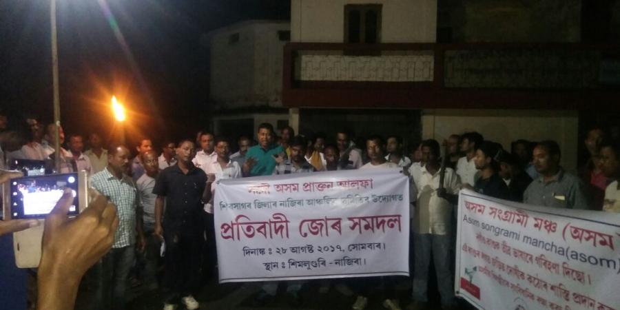 নগাঁও জিলাত অনা-অসমীয়া ব্যবসায়ীয়ে থলুৱা যুৱকক কৰা আক্ৰমণৰ প্ৰতিবাদত প্ৰাক্তন আলফা সমন্বয় ৰক্ষী সমিতিৰ নাজিৰাৰ মহকুমা সমিতিৰ উদ্যোগত আৰু আছু, টাইপা, যুৱ-ছাত্ৰ পৰিষদ, সংগ্ৰামী যুৱ মঞ্চ, আহোম গণ মঞ্চ, পিপলছ ফৰাম আদি সংগঠনৰ সহযোগত প্ৰায় ৫ শতাধিক লোকে জোৰঁ লৈ সমদল উলিয়ায় উত্তাল প্ৰতিবাদ সাব্যস্ত কৰে৷