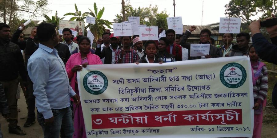 সদৌ অসম আদিবাসী ছাত্ৰ সন্থাৰ তিনিচুকীয়া জিলা সমিতিৰ নেতা-কৰ্মীয়ে হাতে হাতে বেনাৰ-প্লেকাৰ্ড লৈ গোলাঘাট জিলাৰ বগীধল কাণ্ডৰ উচিত বিচাৰ কৰা, চাহ জনগোষ্ঠীক জনজাতিকৰণ কৰা আৰু শ্ৰমিকৰ মজুৰি ৩৫০ টকালৈ বৃদ্ধি কৰাৰ দাবীত তিনিচুকীয়া জিলা উপায়ুক্ত কাৰ্যালয়ৰ সন্মুখত প্ৰতিবাদ সাব্যস্ত কৰে।