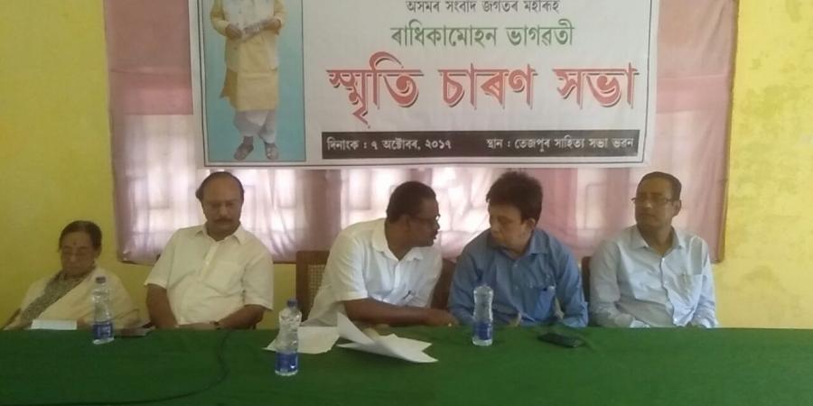 তেজপুৰঃ দেশ আৰু জনগণৰ বাবে হাতত কলম তুলি লৈ আজীৱন জনগণৰ সেৱা কৰি যোৱা ৩০ ছেপ্তেম্বৰত আমাৰ মাজৰ পৰা অচিনা দেশলৈ গুছি যোৱা অসমৰ দৈনিক বাতৰি কাকতৰ পিতামহ জ্যেষ্ঠ সম্পাদক, পণ্ডিত তথা বিশিষ্ট বুদ্ধিজীৱী ৰাধিকা মোহন ভাগৱতীক শনিবাৰে তেজপুৰত স্মৰণ কৰে ৰাইজে৷