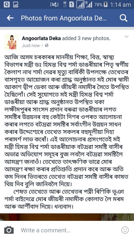 নগাঁওঃ বটদ্ৰৱা সমষ্টিৰ বিধায়িকা আঙুৰলতা ডেকাই কিছুদিন পুৰ্বে নিজ সন্তানক কোলাত লৈ স্বাস্থামন্ত্ৰী হিমন্ত বিশ্ব শৰ্মাৰ ঘৰলৈ আহিছিল এটি বিশেষ অনুষ্ঠানত অংশ গ্ৰহণৰ বাবে৷ নিজৰ দলৰ বিধায়িকা আঙুৰলতাৰ সন্তানক হিমন্ত বিশ্ব শৰ্মাই কোলাত লৈ আদৰ কৰাৰ ফটো ফেচবুকত খোদ আপলোড কৰি তেওৰ সমষ্টিৰ বহু সমস্যাৰ কথা মন্ত্ৰীগৰাকীৰ সৈতে আলোচনা কৰা বুলি কৈছিল৷