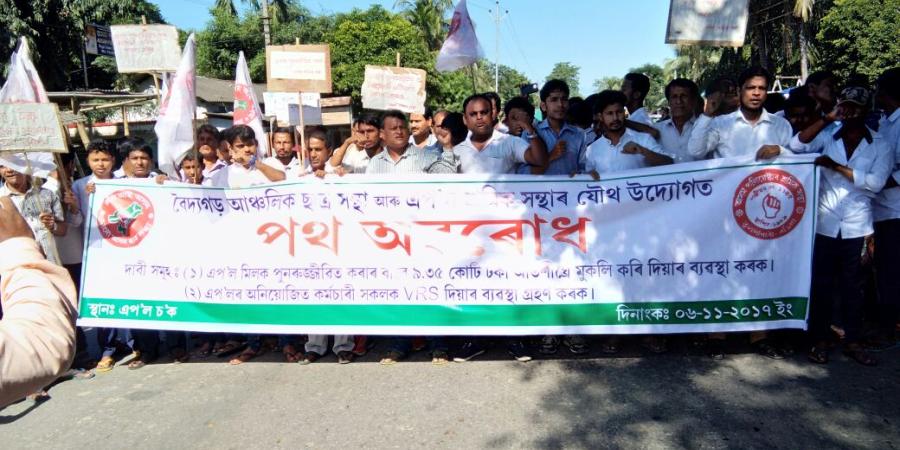 বৈদ্যগড় আঞ্চলিক ছাত্ৰ সন্থাৰ উদ্যোগত তথা এপল মিল শ্ৰমিক সন্থাৰ সহযোগত মিলটোৰ মুখ্য গেটত পুৱা ১০ বজাৰ পৰা তথা বাৰত-ভূটান ৰাষ্ট্ৰীয় ঘাই পথ অৱৰোধ কৰি শীঘ্ৰে এপলমিল কাৰ্যক্ষম কৰাৰ দাবী জনায়৷ কাৰ্যসুচীত স্হানীয় বিদ্যালয়ৰ ছাত্ৰ-ছাত্ৰী তথা শ্ৰমিক-কৰ্মচাৰয়ে হাতে হাতে প্লেকাৰ্ড লৈ চৰকাৰ বিৰোধি শ্ল’গানেৰে পৰিবেশ উত্তাল কৰি তোলে৷ প্ৰতিবাদকাৰীসকলে অসম চৰকাৰ হায় হায়, এপল পুণৰ উজ্জীৱিত কৰক আদি শ্ল’গানেৰে আকাশ বতাহ কপাই তোলে৷
