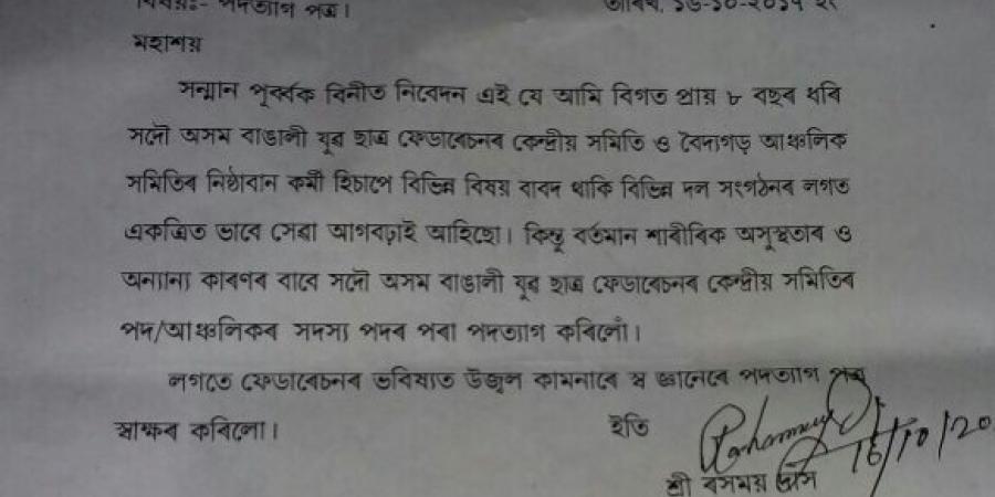 তুলসীবাৰীঃ সদৌ অসম বাঙালী যুৱ ছাত্ৰ ফেডাৰেচনৰ কেন্দ্ৰীয় সহকাৰী সম্পাদক ৰসময় দাস আৰু বৈদ্যগড় আঞ্চলিক সমিতিৰ নেতা দিলীপ দাসে সংগঠনটোৰ পৰা পদত্যাগ কৰিছে৷