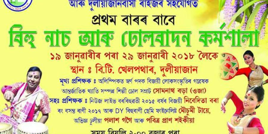তাৰে মাজতে ১৯-২৯ জানুৱাৰীত দুলীয়াজানৰ বি টি খেলপথাৰত আঞ্চলিক সোনোৱাল কছাৰী নাৰী সন্থাৰ উদ্যোগত অনুষ্ঠিত হ'ব বিহু নাচ আৰু ঢোল বাদন কৰ্মশালা । জানিব পৰা মতে, কৰ্মশালাত কেইবাগৰাকী আগশাৰীৰ প্ৰশিক্ষকে প্প্ৰৰশিক্দাষণ প্নৰদান কৰিব ৷ নিউজ লাইভৰ বৰ বিহুৱতি ২০১৫, বসন্তৰাণী ২০১৭ খ্যাতি অৰ্জন কৰা নাচনীয়েও প্ৰশিক্ষণ প্ৰদান কৰিব বুলি জানিব পৰা গৈছে৷